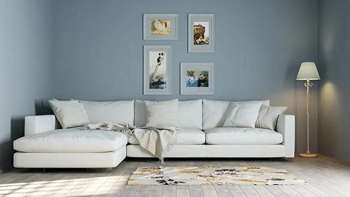 - Пыльно-голубой – за счет серого подтона выглядит более сдержанным и глубоким. Подходит для помещений, расположенных с южной стороны.