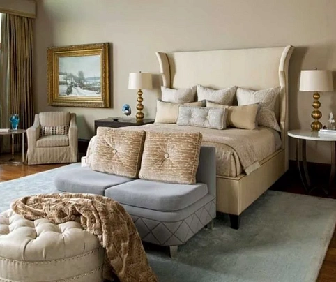 В спальне банкетки и пуфы обычно располагают возле туалетного столика или кровати. Туда можно положить плед или личные вещи. Во время сборов удобно сесть на пуфик или банкетку для нанесения макияжа.