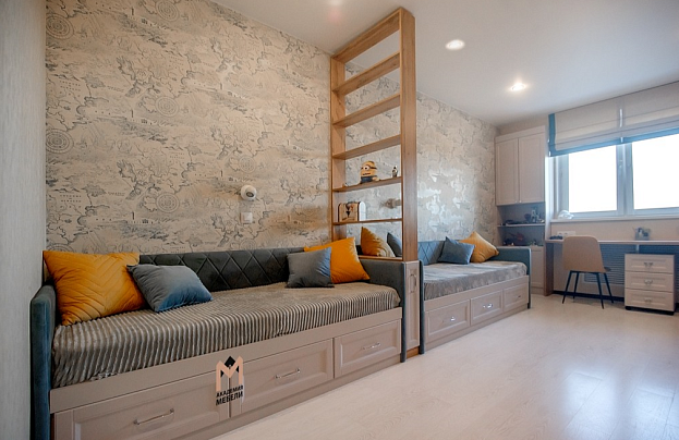 - Расстановка мебели. Мебель можно разместить так, чтобы она создавала естественные границы между зонами и формировала персональное пространство для каждого ребенка. Для разделения места подойдут книжные полки, перегородки, стеллажи и комоды.