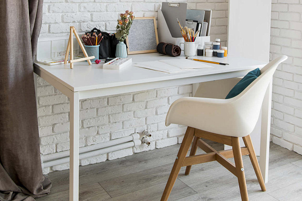 - Настольная лампа. Даже при хорошем дневном освещении лампа необходима. Она должна быть с гибким корпусом, чтобы легко менять направление света. Лучше выбирать нейтральный белый свет (4000–4500 К), он максимально приближен к естественному и не искажает цвета.