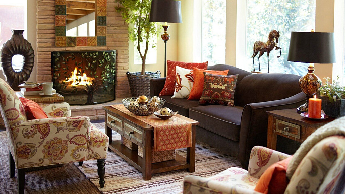 Отдавайте предпочтение теплым природным оттенкам: терракотовому, карамельному, оливковому, бордовому. Если не планируете перекрашивать стены, добавьте нужные цвета через текстиль - подушки, шторы или ковер.