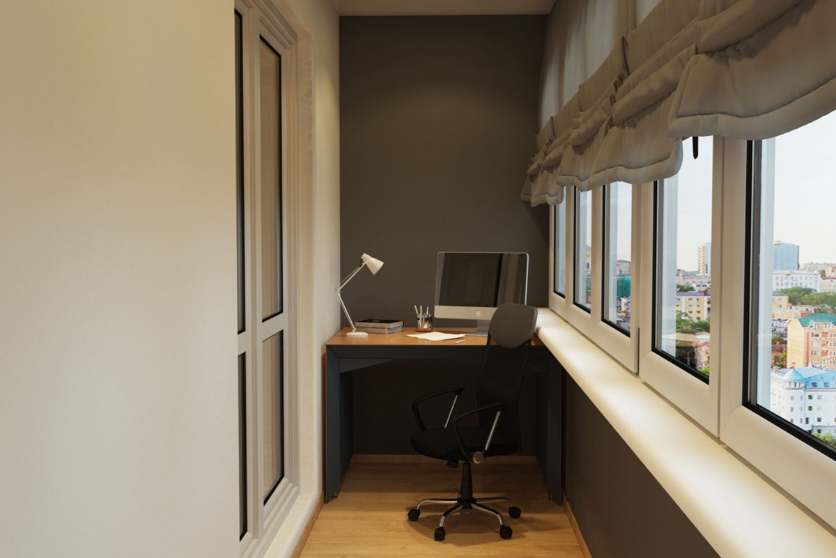 Если требуется место для учебы или удаленной работы, лоджия может стать идеальным решением:- узкий письменный стол или встроенная столешница,