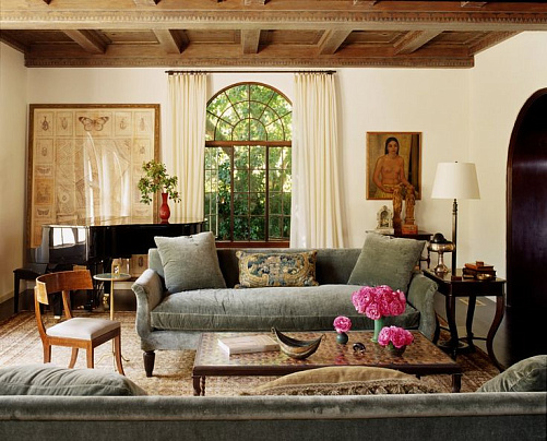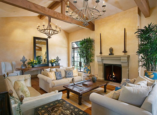 Остановиться на плетеных креслах и диванах, деревянном столике с резьбой и коваными элементами, а в качестве декора использовать элементы из других культур: африканские маски, китайские вазы, путеводители по далеким странам, ковры, шкуры и зеркала в дорогих рамах.