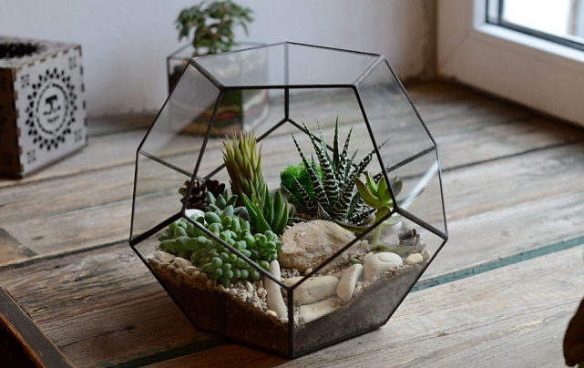 Флорариум – это подобие аквариума. Внутри стеклянной емкости создают мини-сад с собственной экосистемой. Для эффектного внешнего вида флорариумы выполняют в форме капли или шара. Они подвешиваются к потолку или другому объекту или устанавливаются на стол. В качестве грунта используется подложка из песка, гравия и мелких ракушек. Внутри сажают неприхотливые травянистые растения, которые растут без потребности в минеральных веществах. Для флорариума отлично подойдут тилласандия, суккуленты и экзотические растения.