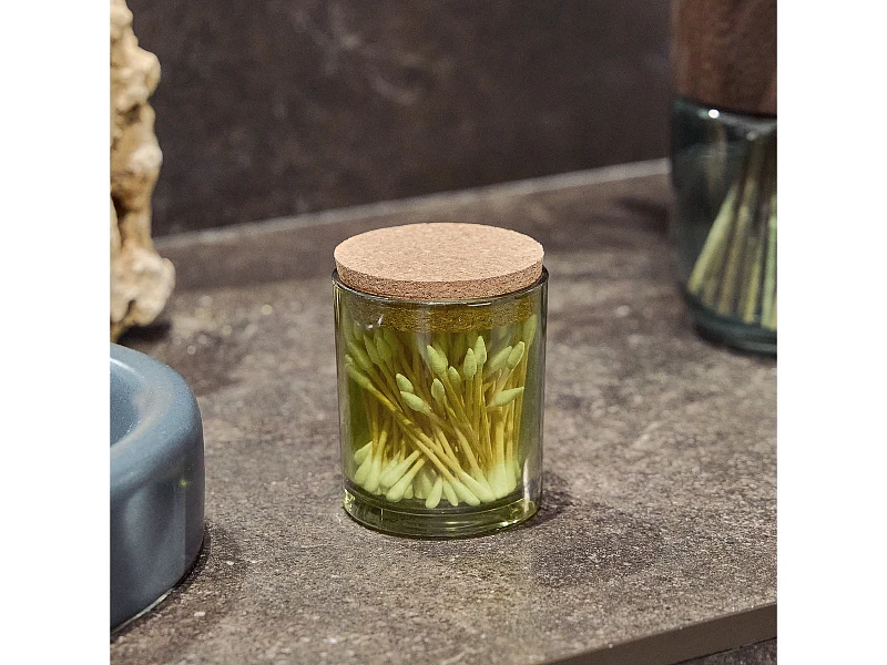 Контейнер для ватных дисков Teriberka из стекла зеленого цвета объемом 230 мл. Прокрашенное стекло позволяет аксессуару выделяться на фоне раковины. Контейнер обладает надежной пробковой крышкой, защищающей содержимое от выпадения и влаги. Удобная высота и ширина позволяют хранить в контейнере ватные диски, ватные палочки и другие принадлежности.
