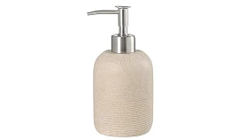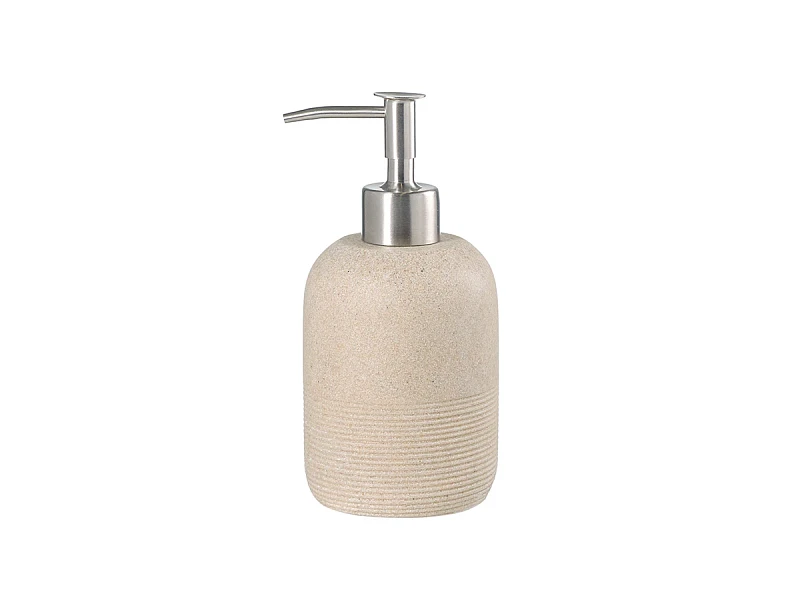 Диспенсер для жидкого мыла Loup имеет корпус из полирезина, стилизованного под натуральный камень бежевого оттенка. Материал отличается устойчивостью к влаге, ударам и царапинам, что делает его идеальным выбором для ванной комнаты. Наружные элементы дозирующего механизма выполнены из нержавеющей стали, обладающей высокой прочностью, долговечностью и отличными антикоррозионными свойствами. Кроме того, ее блестящая поверхность придает изделию презентабельный вид.