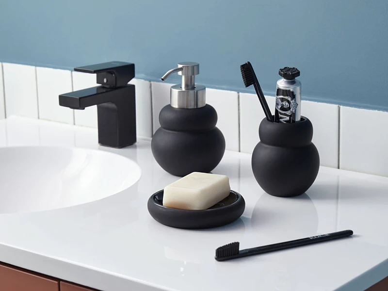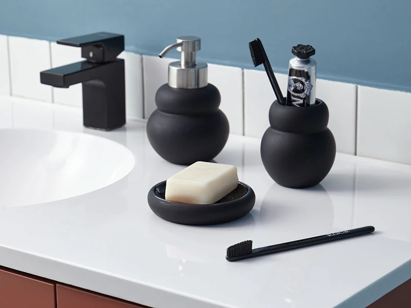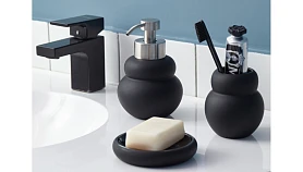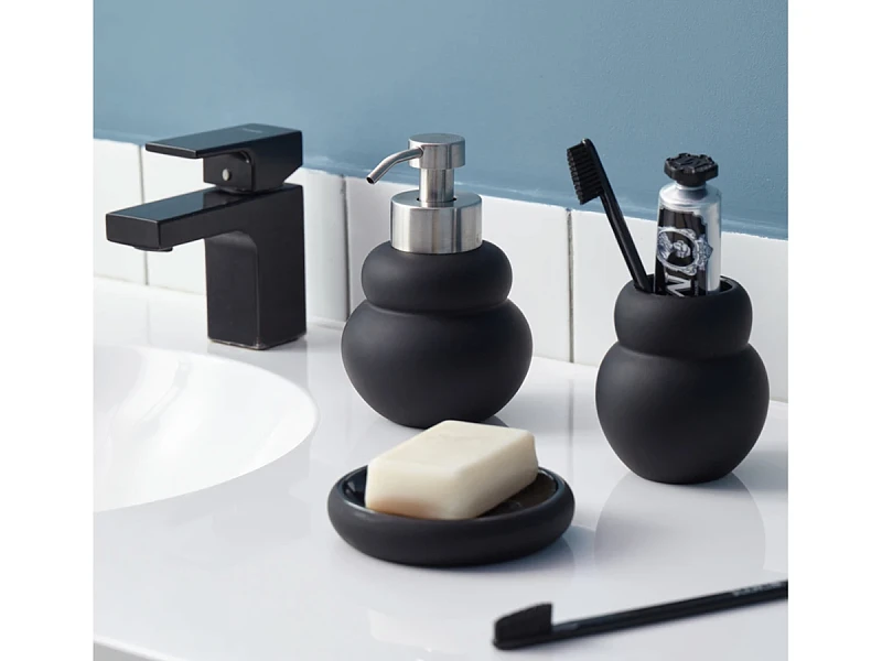 Диспенсер для жидкого мыла Mark имеет корпус из керамики с матовым покрытием черного цвета. Материал экологичный, устойчив к воздействию влаги и температурным перепадам. Наружные элементы дозирующего механизма изготовлены из нержавеющей стали, обладающей высокой прочностью, долговечностью и антикоррозионными свойствами. Комбинация матовых и глянцевых фактур делает дизайн интересным.