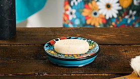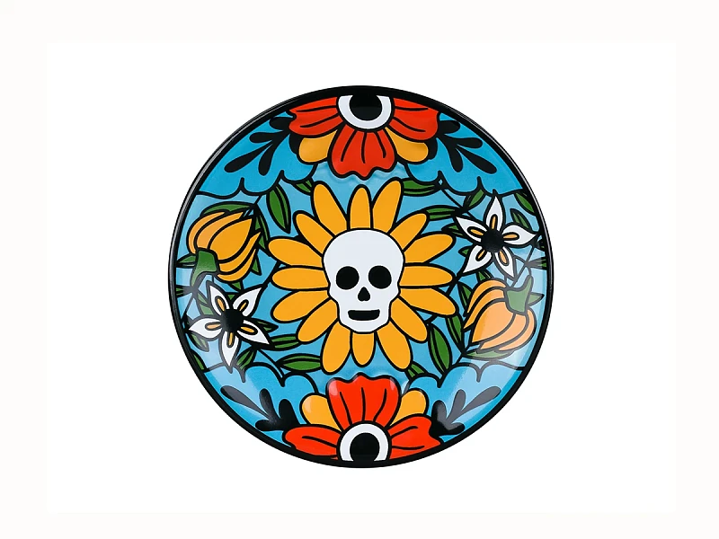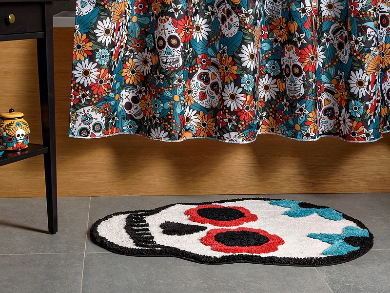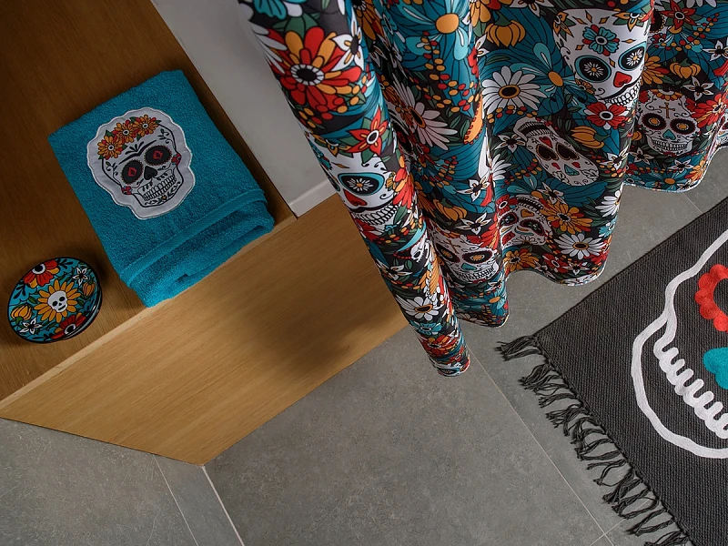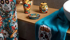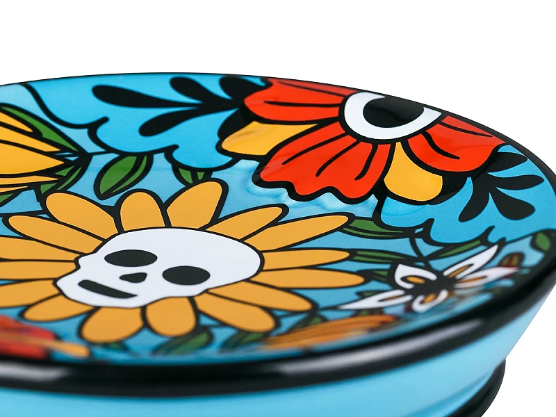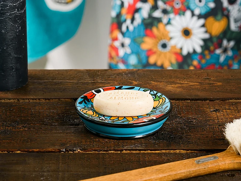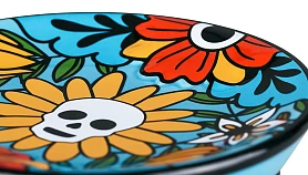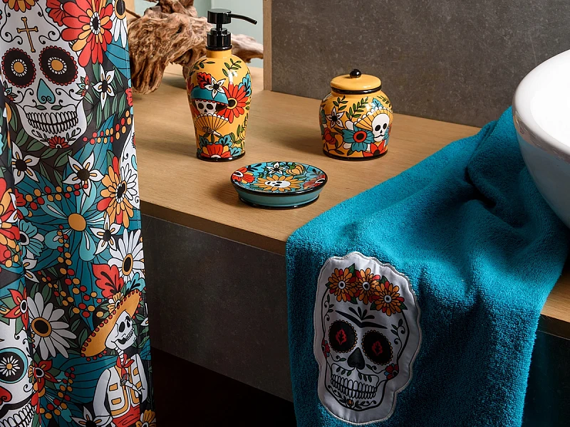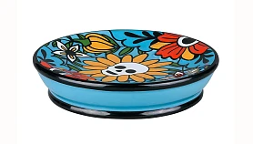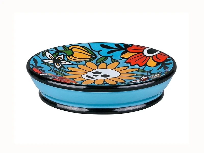 Мыльница керамическая для ванной на столешницу или раковину с объемным рисунком черепа с цветами, является частью коллекции Los Muertos, в которой есть все необходимое, чтобы наполнить интерьер ванной комнаты яркими красками мексиканского праздника. Выпуклые части не дадут мылу прилипнуть Покрытие: глянцевая глазурь Объемный рисунок Печатный деколь. Протирать с помощью мыльного раствора мягкой тряпкой. Не рекомендуется использовать абразивные и химически активные вещества для ухода за изделием. Не класть в морозильник, посудомоечную машину, микроволновую печь.