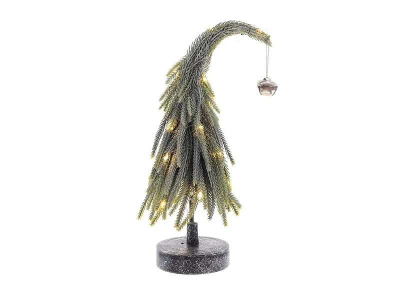 Декоративное изделие Елка с подсветкой – это искусственная елочка высотой 32 см, установленная на круглой подставке. Ее изогнутая вниз верхушка напоминает традиционную новогоднюю шапку, а свисающий золотой бубенчик придаёт игривый акцент. Елочка украшена светодиодной гирляндой, создающей мягкий теплый свет, что добавляет уюта. Она работает от трех батареек типа AAA, которые не входят в комплект, идеально подходит для создания праздничной атмосферы в любом уголке вашего дома.