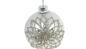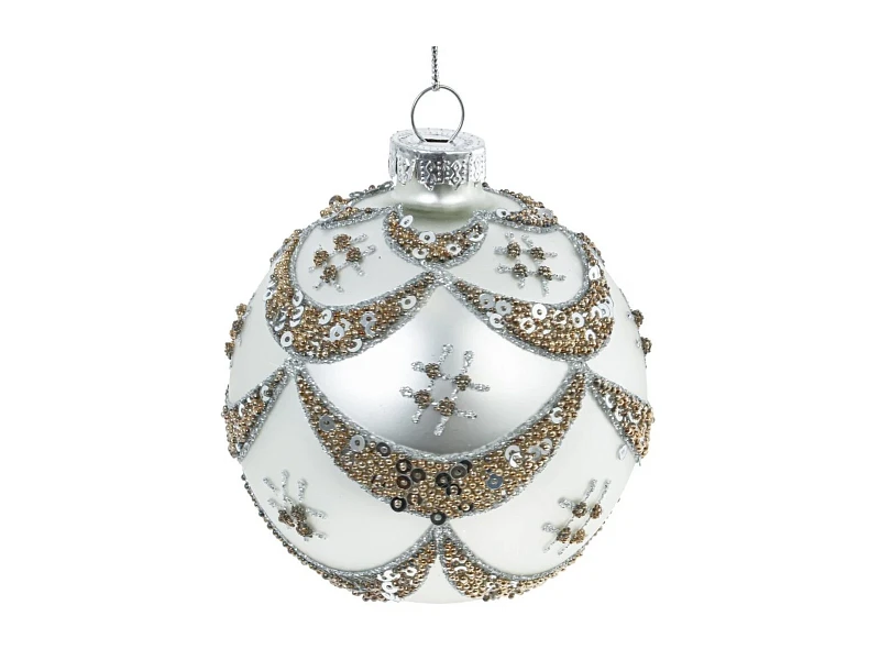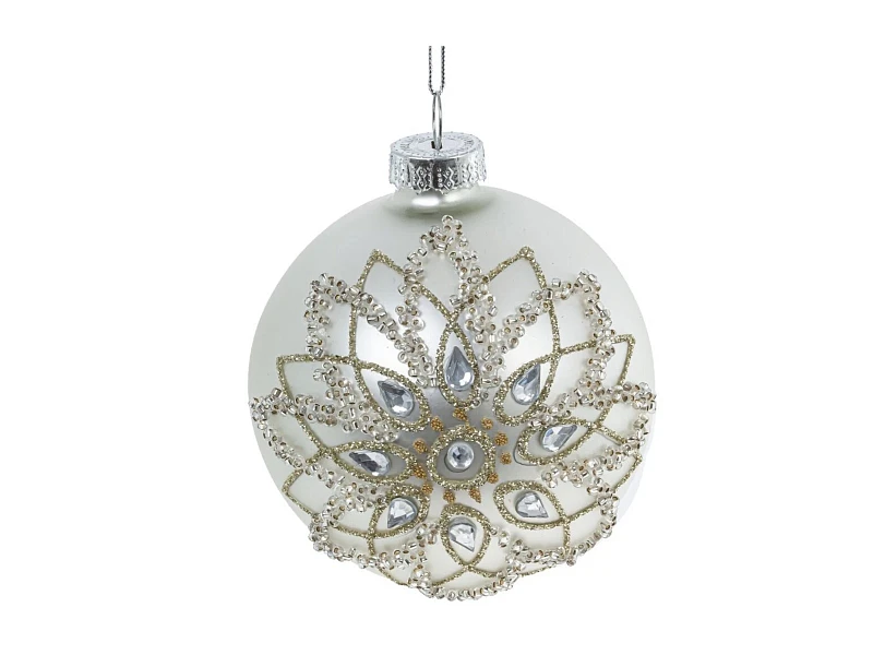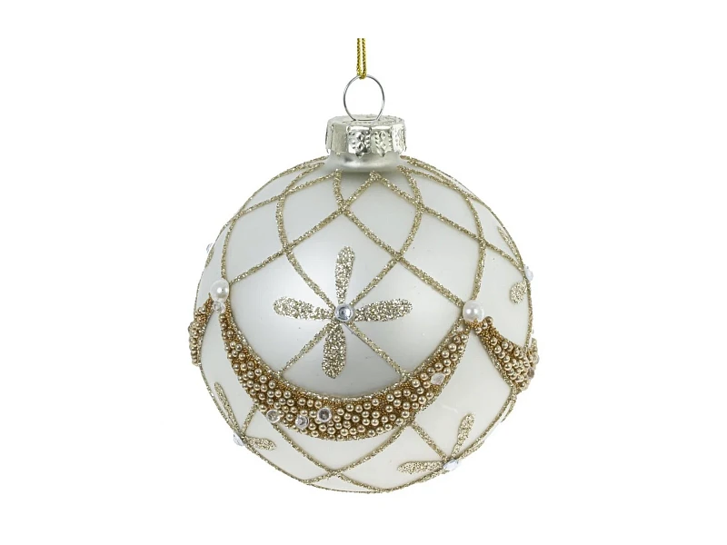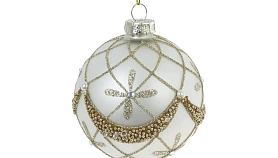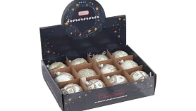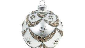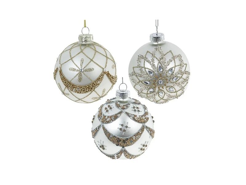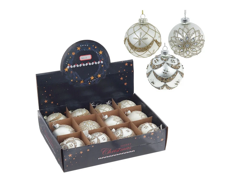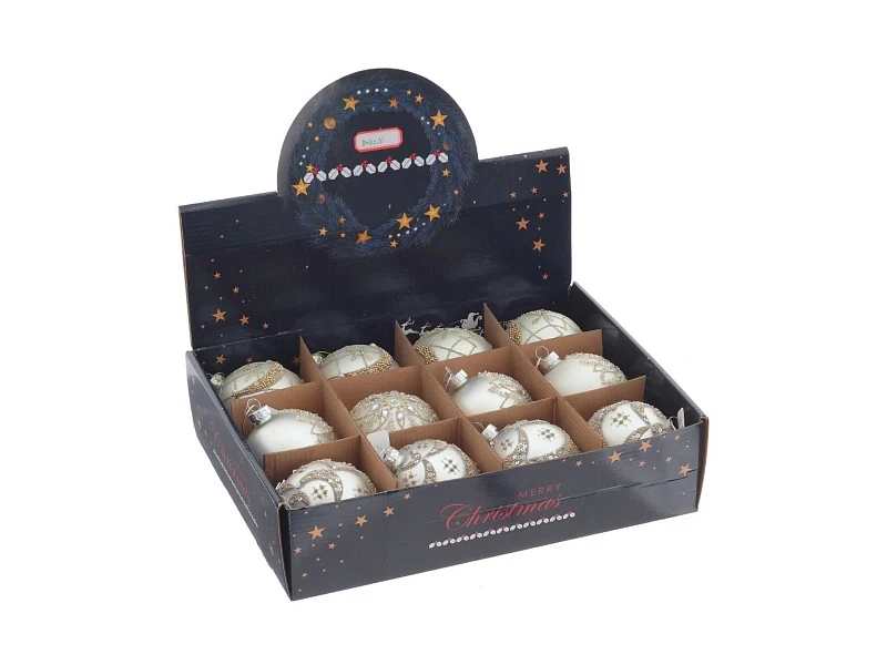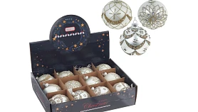 Набор из двенадцати стеклянных елочных шаров в бело-золотистых оттенках, украшенных рисунками из серебристого глиттера и стразами. В комплекте представлены три вида шаров, по четыре каждого. Этот набор поможет вам создать стильную и гармоничную новогоднюю атмосферу в вашем доме. Шары отлично будут смотреться как на классической елочке, так и на современном декоре, добавляя изящности и блеска праздничному интерьеру.