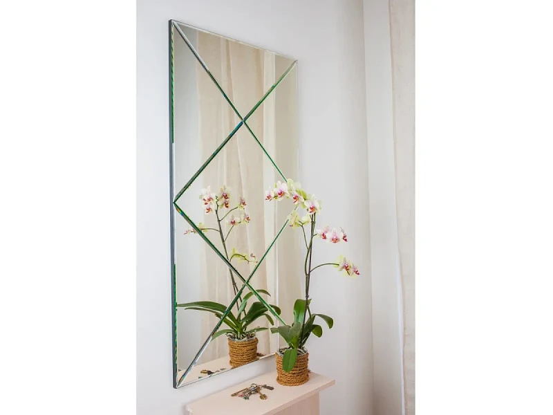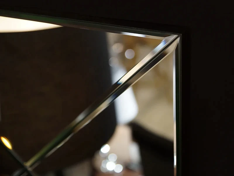 Стеклодетали закреплены на подзеркальных щитах с помощью клеевой двусторонней ленты и клея герметика. Зеркало возможно навешивать как в вертикальном так и в горизонтальном положении.