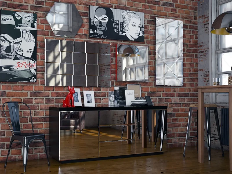 Зеркало настенное Facet представляет собой конструкцию из зеркальных деталей в виде треугольников и квадратов, установленных на подзеркальный щит.