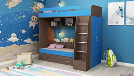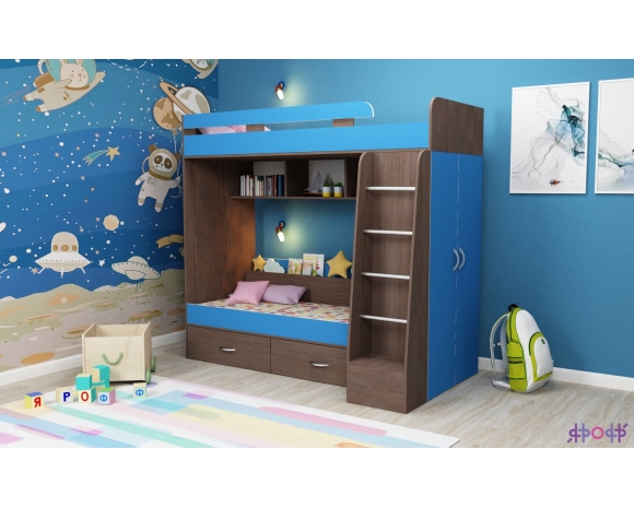 Очень практичная и удобная модель, занимает в комнате место, как одно спальное место, а по факту Вы получаете два спальных места, большие, прочные выкатные ящики и вместительный шкаф в . В модели предусмотрен вместительный шкаф, в котором можно развесить одежду, а также выдвижные большие ящики, которые можно загружать полностью, так как у них прочное днище и надежные направляющие. Двухъярусная детская кровать «Юниор-6» выполнена в лаконичном современном стиле, она органично впишется в любой интерьер. при этом цвет корпуса и фасада вы можете выбрать сами из представленной линейки оттенков.