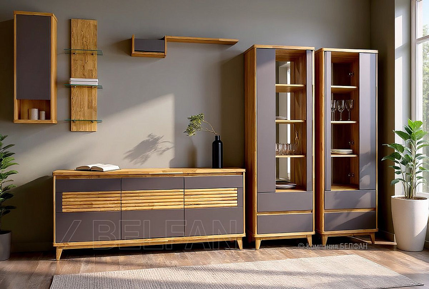 ? Полка изготовлена из комбинации материалов - массива дуба и эмали. Из массива дуба изготовлены корпус полки в цвете «бейц-масло, графит, белёный дуб, серый дуб» и вставка в цвете «бейц-масло, графит, белёный дуб, серый дуб».