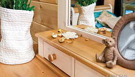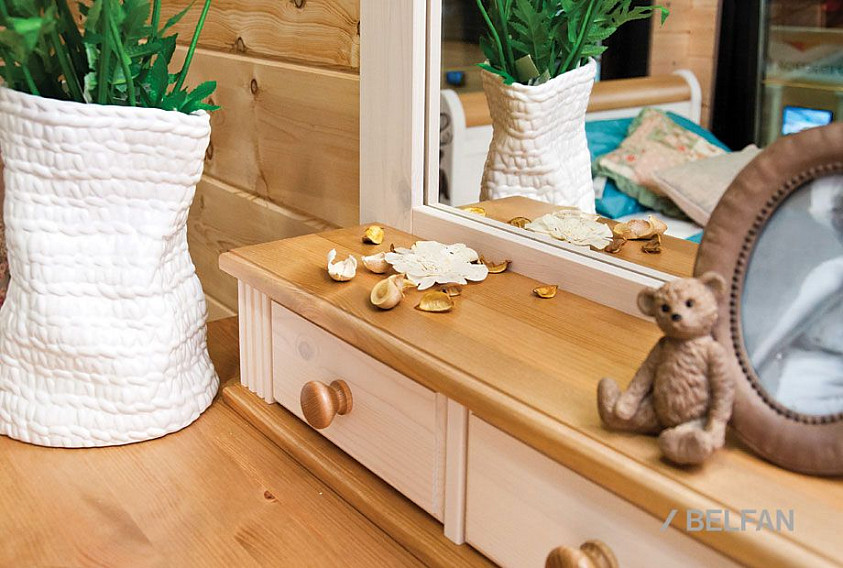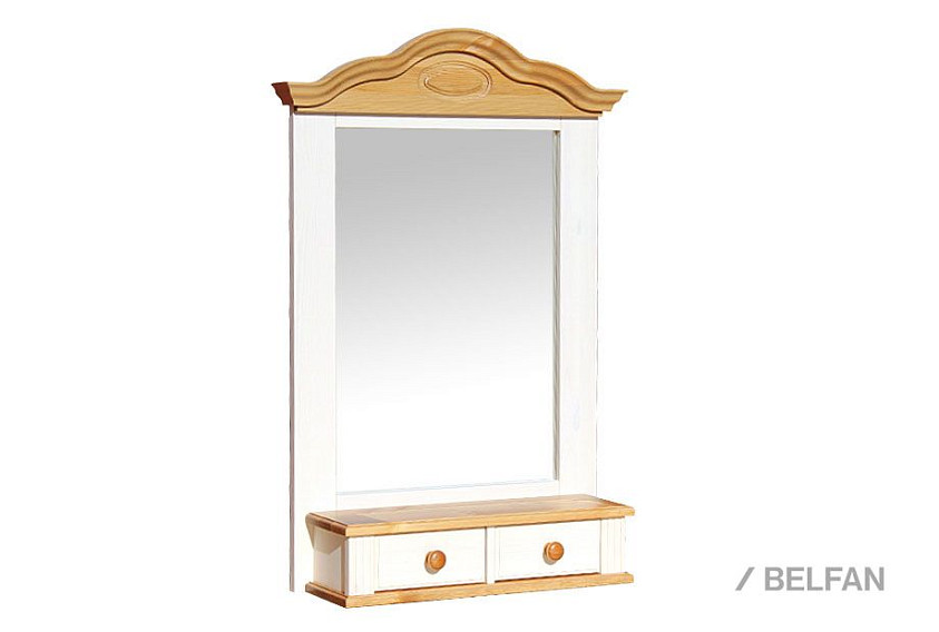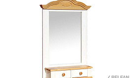 Полка-зеркало «Синди» (Sindy) из массива сосны. Состоит из зеркального полотна, вставленного в раму. Так же имеются 2 небольших ящика под хранение мелких предметов. Оснащено приспособлениями для вывешивания на стене.