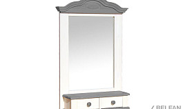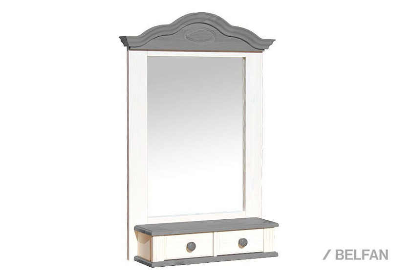 Полка-зеркало «Синди» (Sindy) из массива сосны. Состоит из зеркального полотна, вставленного в раму. Так же имеются 2 небольших ящика под хранение мелких предметов. Оснащено приспособлениями для вывешивания на стене.