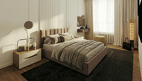 Мягкое, вертикально оформленное изголовье, выглядит современно и элегантно, визуально вытягивает пространство и делает интерьер более гармоничным. Обивка из велюра в универсальном оттенке легко вписывается в любой стиль — от минимализма и скандинавского до современного и неоклассики.