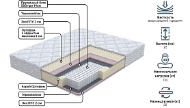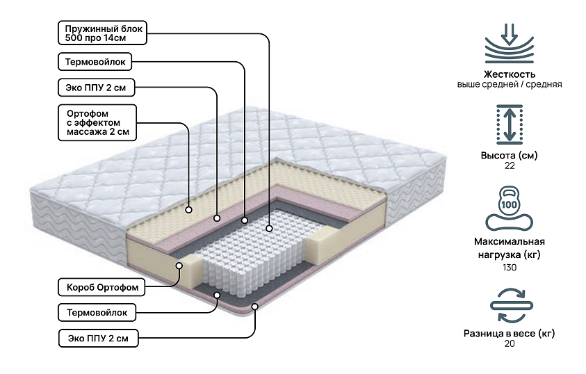 Матрас двухсторонний, средней жесткости с одной стороны и выше средней с другой, что позволит изменять ощущения от матраса в зависимости от предпочтений. В основе матраса 512 независимых пружин на спальное место, обладающие ортопедическими свойствами. В составе комфортных слоев Ортофом с массажным эффектом в сочетании с Эко ППУ с одной и Эко ППУ с другой стороны. Чехол матраса выполнен из трикотажной ткани, простеганный на дополнительном слое Ортофом.