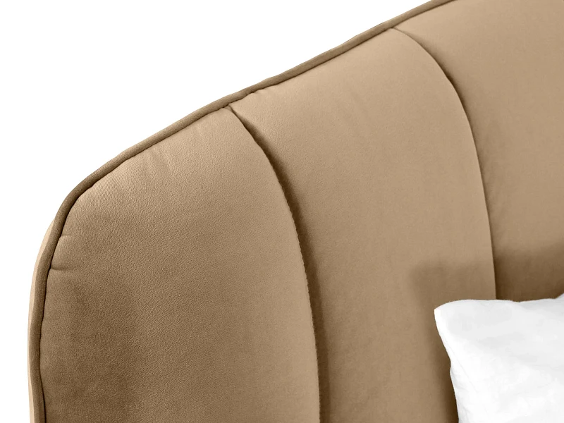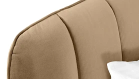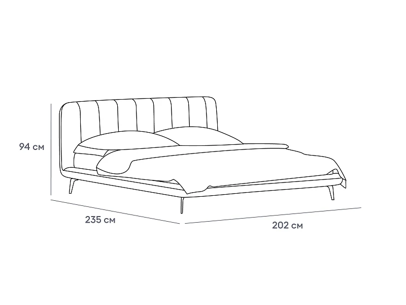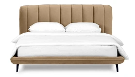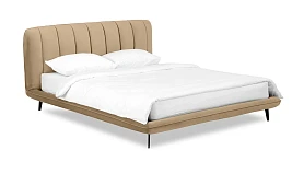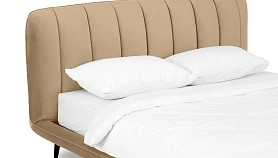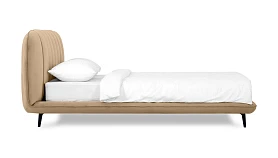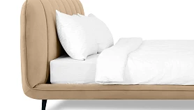 Прочные ножки из металла незаметно приподнимают корпус над полом. Поэтому кровать смотрится воздушно. Также это упрощает уборку. Мягкие изящные царги плавно перетекают в изголовье, единство с которым подчеркивается рельефным кантом.