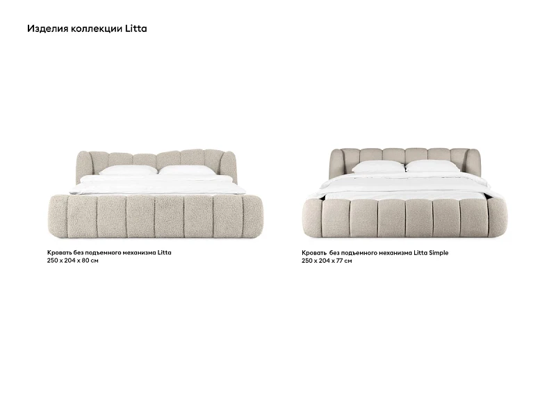 Litta Simple — кровать, дизайн которой сочетает в себе актуальность мягких форм и выразительность плавной архитектуры. Её отличительными чертами являются пышные очертания и вертикальная стёжка с равномерным чередованием по всему периметру — от высокого изголовья до боковых царг. Что придает модели уютный вид, объём и фактуру. Словно мягкие волны формируют специально для вас деликатную зону отдыха и релакса.