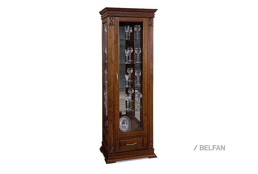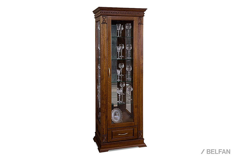 Идеальным дополнением к гостиной, меблированной в классическом стиле, станет однодверный шкаф с витриной из коллекции «Верди Люкс». Несмотря на свою массивность и основательность, этот предмет мебели не займет много места в Вашей комнате, а только лишь, наоборот, станет ее украшением и изюминкой. Благородные цвета крашения вкупе с зеркальными полками и задней зеркальной поверхностью шкафа подчеркивают изысканность, свойственную классическому стилю, а декоративная резьба на пилястрах и фигурный цоколь придают шкафу утонченности и «воздушности». Вместительный выдвижной ящик делает его не только красивым, но и функциональным.