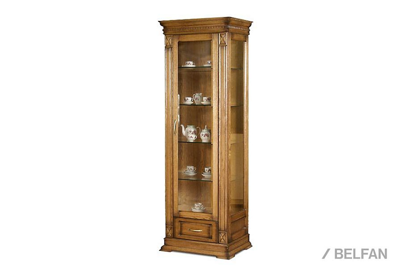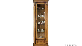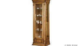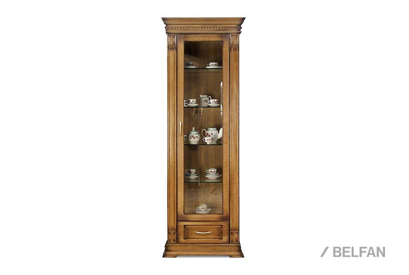 Идеальным дополнением к гостиной, меблированной в классическом стиле, станет однодверный шкаф с витриной из коллекции «Верди Люкс». Несмотря на свою массивность и основательность, этот предмет мебели не займет много места в Вашей комнате, а только лишь, наоборот, станет ее украшением и изюминкой. Благородные цвета крашения вкупе с зеркальными полками и задней зеркальной поверхностью шкафа подчеркивают изысканность, свойственную классическому стилю, а декоративная резьба на пилястрах и фигурный цоколь придают шкафу утонченности и «воздушности». Вместительный выдвижной ящик делает его не только красивым, но и функциональным.