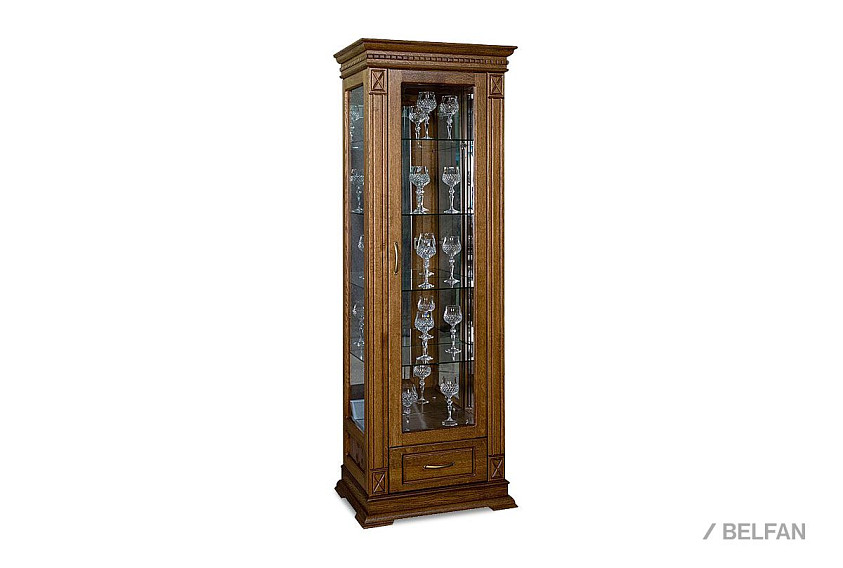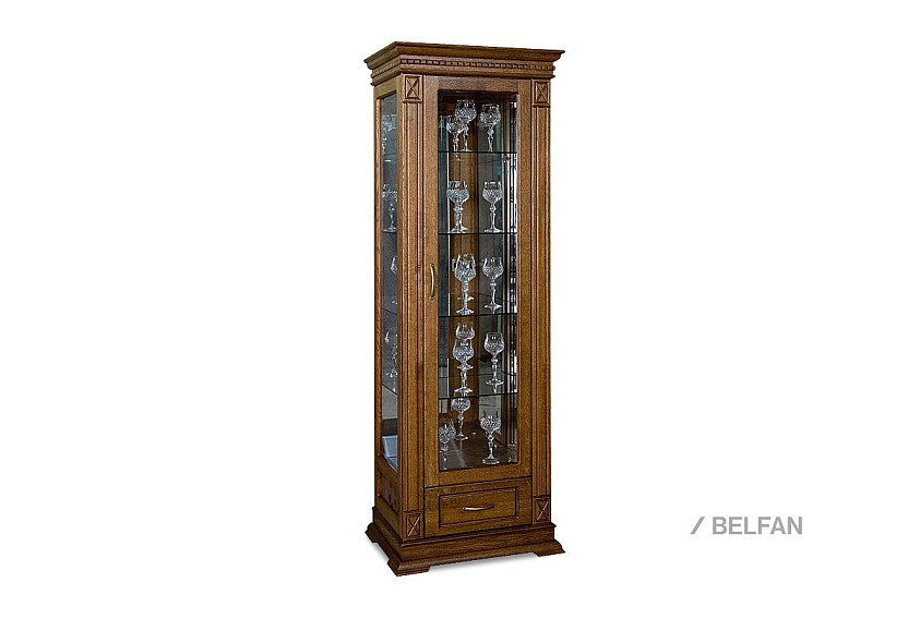 Идеальным дополнением к гостиной, меблированной в классическом стиле, станет однодверный шкаф с витриной из коллекции «Верди Люкс». Несмотря на свою массивность и основательность, этот предмет мебели не займет много места в Вашей комнате, а только лишь, наоборот, станет ее украшением и изюминкой. Благородные цвета крашения вкупе с зеркальными полками и задней зеркальной поверхностью шкафа подчеркивают изысканность, свойственную классическому стилю, а декоративная резьба на пилястрах и фигурный цоколь придают шкафу утонченности и «воздушности». Вместительный выдвижной ящик делает его не только красивым, но и функциональным.