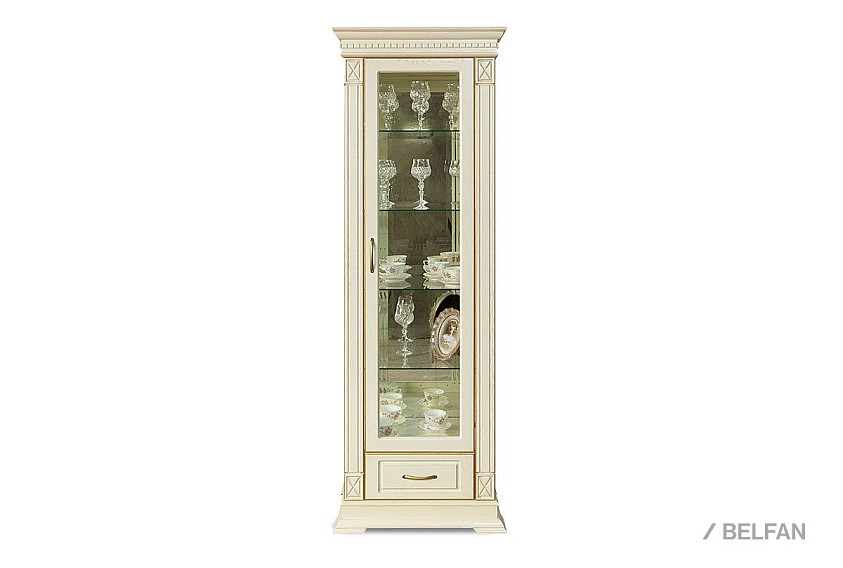 Идеальным дополнением к гостиной, меблированной в классическом стиле, станет однодверный шкаф с витриной из коллекции «Верди Люкс». Несмотря на свою массивность и основательность, этот предмет мебели не займет много места в Вашей комнате, а только лишь, наоборот, станет ее украшением и изюминкой. Благородные цвета крашения вкупе с зеркальными полками и задней зеркальной поверхностью шкафа подчеркивают изысканность, свойственную классическому стилю, а декоративная резьба на пилястрах и фигурный цоколь придают шкафу утонченности и «воздушности». Вместительный выдвижной ящик делает его не только красивым, но и функциональным.