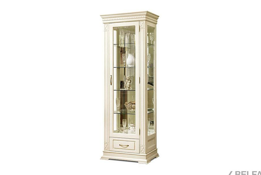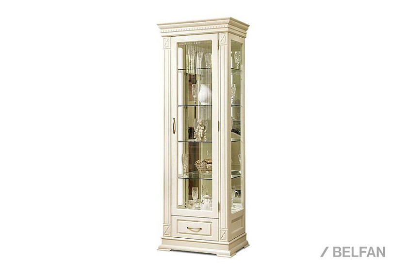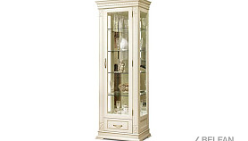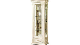 Идеальным дополнением к гостиной, меблированной в классическом стиле, станет однодверный шкаф с витриной из коллекции «Верди Люкс». Несмотря на свою массивность и основательность, этот предмет мебели не займет много места в Вашей комнате, а только лишь, наоборот, станет ее украшением и изюминкой. Благородные цвета крашения вкупе с зеркальными полками и задней зеркальной поверхностью шкафа подчеркивают изысканность, свойственную классическому стилю, а декоративная резьба на пилястрах и фигурный цоколь придают шкафу утонченности и «воздушности». Вместительный выдвижной ящик делает его не только красивым, но и функциональным.