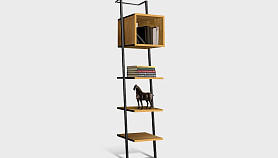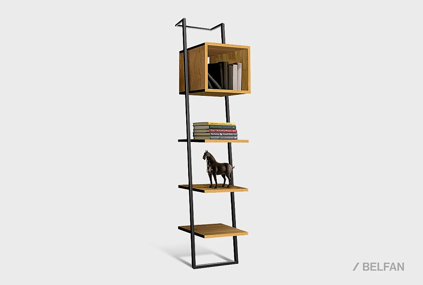 Наклонный узкий стеллаж Art Collection (Арт Коллекшен) 440 с тремя полками и нишей из массива дуба на металлическом каркасе.