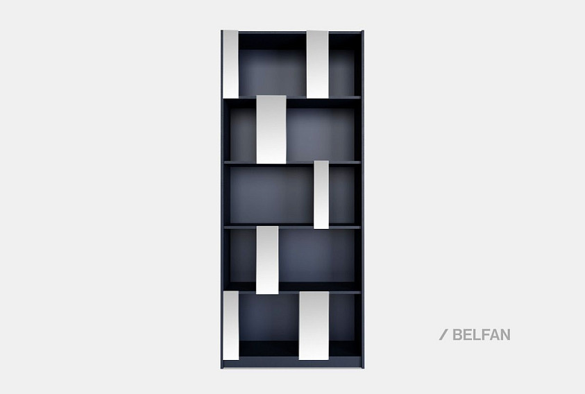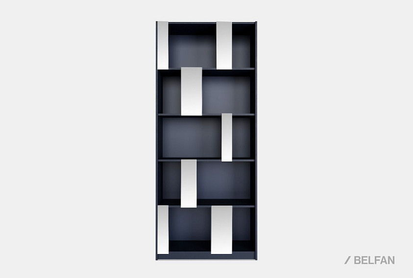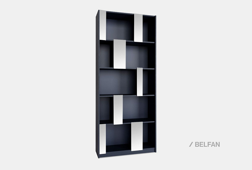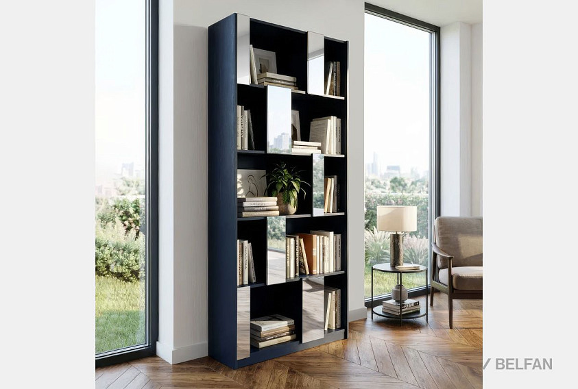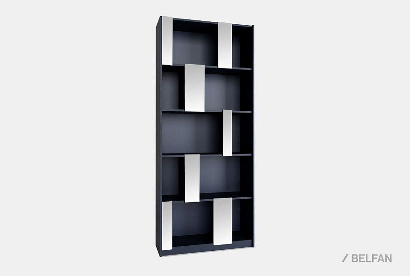Стеллаж «Сакраменто» 100 (с зеркалами) выполнен в минималистичном, но выразительном стиле. Его фасадная геометрия строится на чередовании открытых ячеек разного формата, что создаёт динамичный и оригинальный ритм. Вертикальные панели, облицованные зеркалами, добавляют глубину и воздушность, визуально увеличивая пространство комнаты и отражая свет.