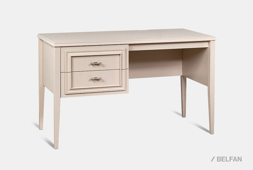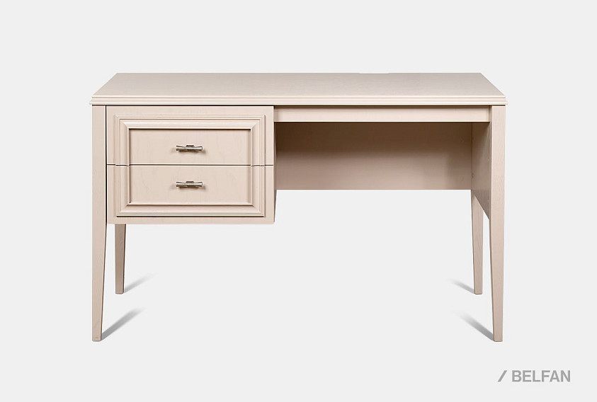 Стол письменный «Сакраменто» (1 тумба слева) сочетает строгую геометрию и утонченную декоративность. Фасады тумбы оформлены объемными рамочными накладками, а изысканные ручки придают образу современный акцент. Два глубоких ящика тумбы расположены слева, обеспечивая удобный доступ и сохраняя просторную рабочую зону справа. Высокие конические ножки визуально «поднимают» конструкцию, добавляя интерьеру легкости.