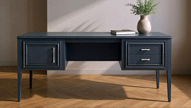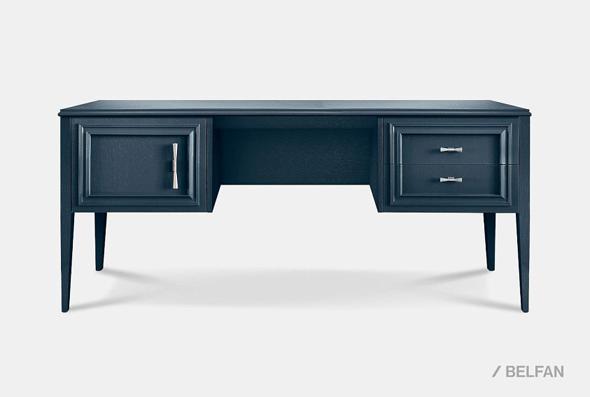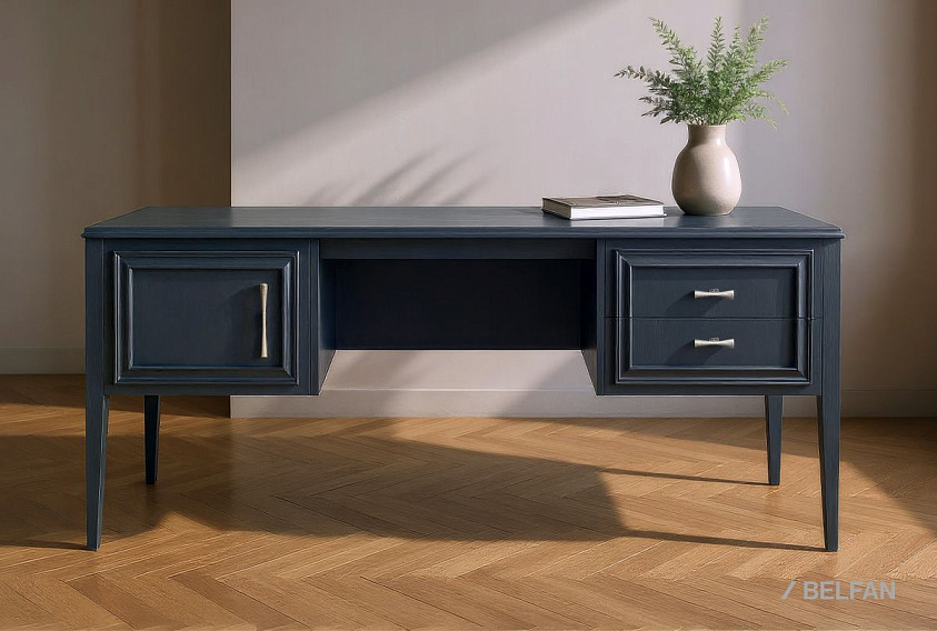 Этот стол станет эффектным акцентом как в классическом кабинете, так и в современном рабочем пространстве. Отделка в цвете «марципан» наполнит комнату светом и создаст ощущение простора, а «сумеречный» оттенок добавит глубины и подчеркнет солидность интерьера.