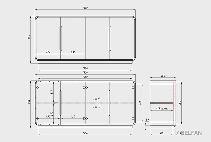 ? Размеры: ширина — 1800 мм, высота — 850 мм, глубина — 460 мм.