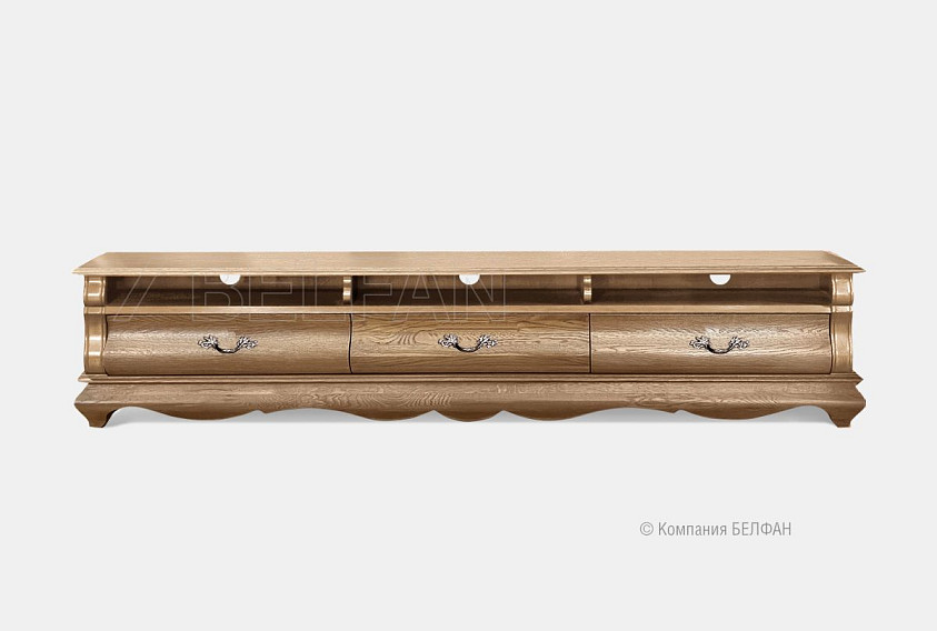 Тумба под ТВ «Оскар» (Oskar) 09 идеально дополнит интерьер современной гостиной. Мебель, выдержанная в современном классическом стиле, характеризуется плавными линиями и продуманностью каждой детали. В схожих с классическими формах прослеживается мягкость и гармония. Изделие выполнено из массива и шпона дуба, поэтому, помимо красивой текстуры, отличается повышенной прочностью. В коллекции представлены тумбы цвета «белая эмаль с темной патиной», «амбэр с белой патиной» и «классик». Дно выдвижных ящиков отделано велюром.