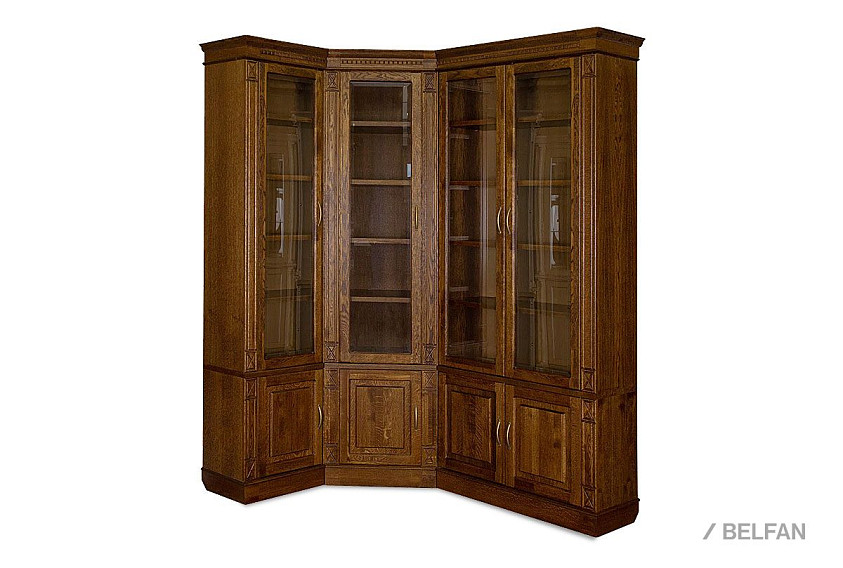Угловой шкаф для библиотеки «Верди Люкс 2» обязательно понравится тем, кто не мыслит своей жизни без книг. Благодаря тому, что верхняя секция оснащена стеклянными дверками, Вы сможете без труда найти нужное издание. Полки, регулируемые по высоте, без труда поместят всю семейную библиотеку. Фигурный цоколь и резные пилястры дополняют образ изделия, делая его законченным.