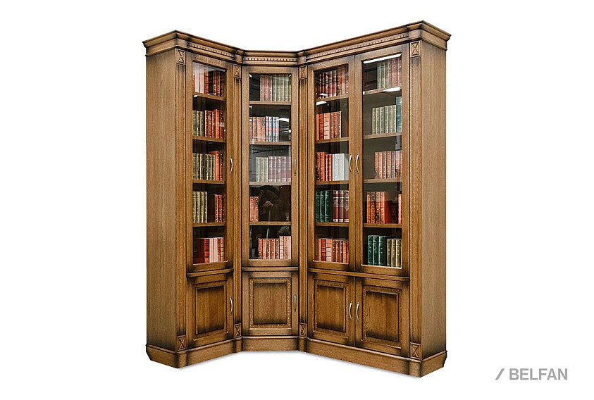 Угловой шкаф для библиотеки «Верди Люкс 2» обязательно понравится тем, кто не мыслит своей жизни без книг. Благодаря тому, что верхняя секция оснащена стеклянными дверками, Вы сможете без труда найти нужное издание. Полки, регулируемые по высоте, без труда поместят всю семейную библиотеку. Фигурный цоколь и резные пилястры дополняют образ изделия, делая его законченным.