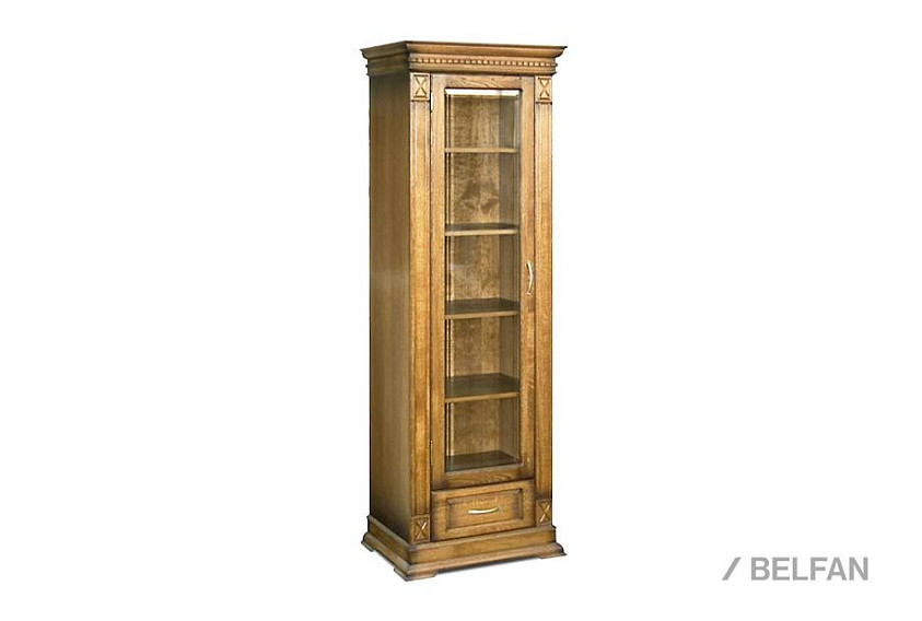 Шкаф из коллекции «Верди Люкс» станет отличным решением для гостиной, меблированной в классическом стиле. В него Вы можете поставить книги, фоторамки, сувениры из поездок, а в небольшой выдвижной ящик положить одежду. Декоративная резьба на пилястрах и фигурный цоколь подчеркивают изысканность, свойственную классическому стилю, а благородные оттенки крашения подчеркнут вкус владельца.