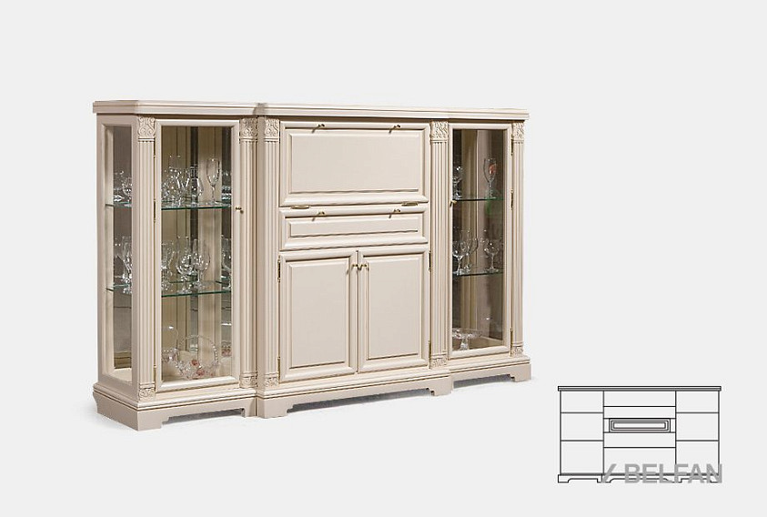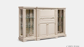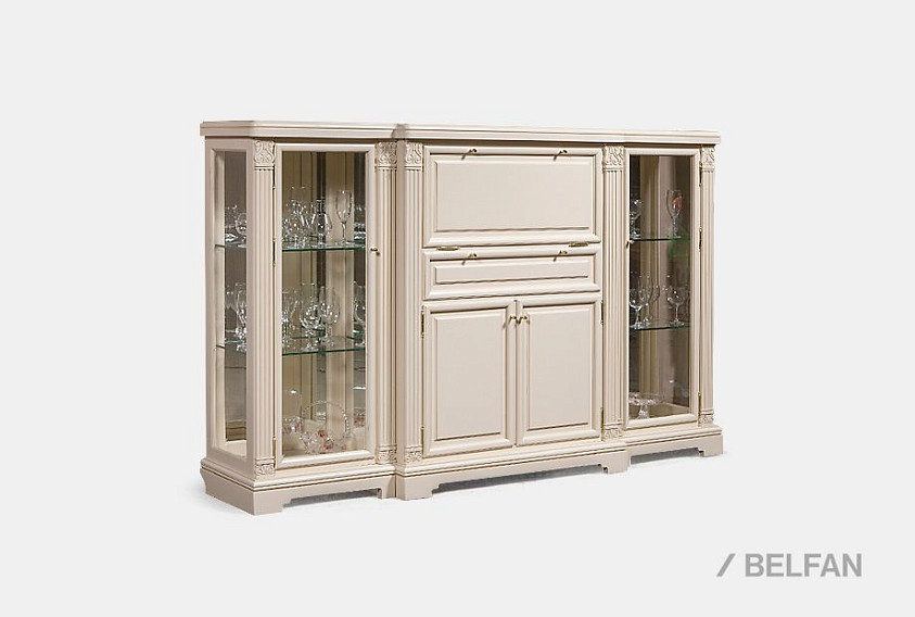 Классический дизайн, в котором представлена тумба из коллекции «Престиж», никогда не устаревает. Сделанная из натурального массива берёзы тумба внесет в любой интерьер нотку стабильности и уюта. Привлекают ее строгие линии и минимум декора в виде классических резных элементов. В выдвинутой вперед центральной части выделяются секретер-бар с откидной крышкой, полки, скрытые за распашными дверцами, и выдвижной ящик. Тумба высокая, но при этом не занимает много места, а множество отделений делает ее достаточно вместительной.