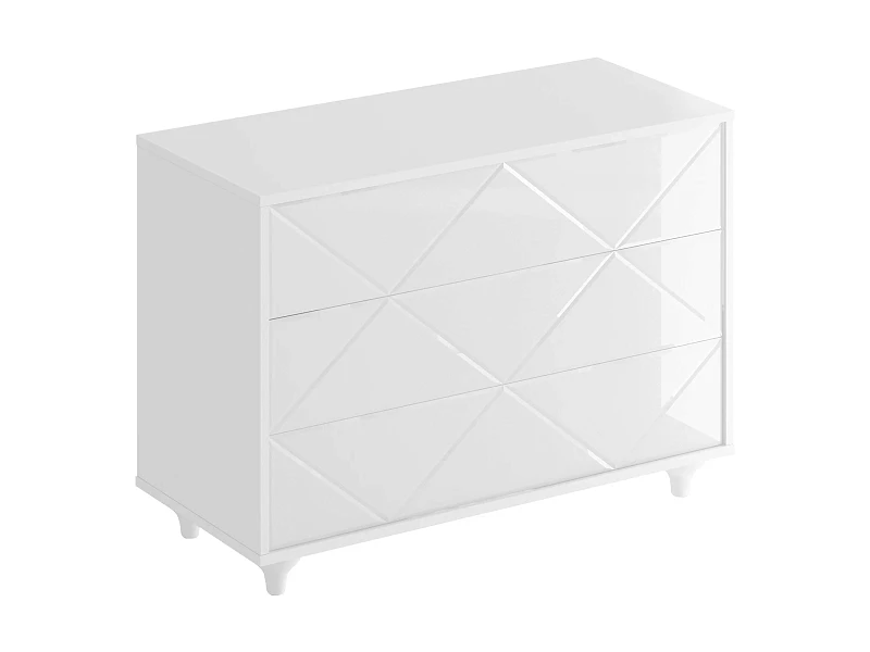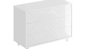 Комод имеет 3 выдвижных ящика. Фасады ящиков декорированы стеклом. Ящики открываются по принципу нажал-открыл. Комод крепится к стене.