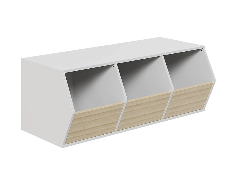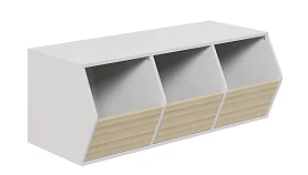 Ящик для игрушек Campi, наличие войлочных подпятников, крепления к стене не предусмотрено. Разделен перегородками на три отделения. Фасадные стенки - стационарные, не открываются. Доступ к отделениям через ниши. Ящик выполнен из ЛДСП 16мм. Декор корпуса: Белая шагрень. Декор фасада: Муссон, Розовый, Ясень коимбра. Нагрузка на крышку – 20кг.