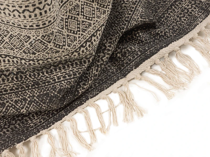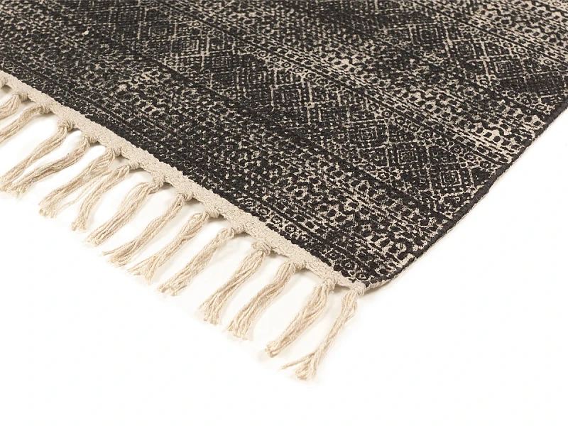 Пригоден как для домашних локаций, так и для зон с высокой проходимостью, например, для прихожей, коридора, лобби, лаундж-зоны. Привлекательный дизайн модели обеспечивают трендовые спокойные оттенки, акцентные элементы — геометрические узоры, бахрома, фактурная выразительность материала.