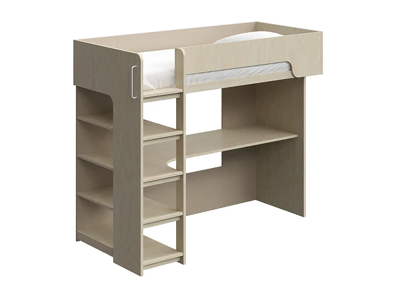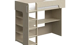 Верхний ярус имеет щитовое основание, установленное на брусках. В нижнем ярусе установлена стационарная столешница. Роль стационарной лестницы выполняют полки. В верхней части установлена металлическая ручка-скоба для удобства пользования лестницей. Спальное место 2000х900мм. Высота ограждения верхнего яруса – 320мм. Высота матраца для верхнего яруса не более 160мм.