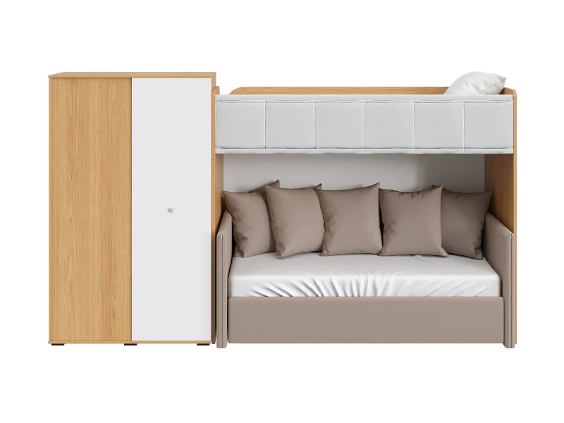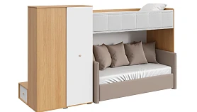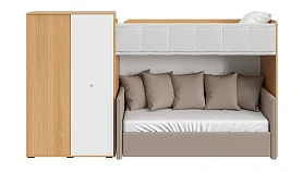 Play — коллекция модульной мебели для детской в спокойных оттенках светлого дерева с локальным добавлением ярких элементов. Естественные формы и цвета подружатся с любой стилевой темой. Подойдет как для дошкольников, так и для подростков. Изделия отвечают главным критериям детской мебели: безопасны, устойчивы, надёжны и эстетичны. Соблюдены экологические показатели, использована ЛДСП класса эмиссии Е1 и Е0,5 — для детской мебели с герметично закрытыми кромками. Из большого количества модулей вы можете спроектировать индивидуальное решение, исходя из потребностей и площади помещения. Для игровой локации, учебного места, спальной зоны, гардероба, хранения игрушек, техники и предметов для творчества — используйте модульные шкафы, стеллажи, тумбы, кровати-чердаки, столы, стеллажи-лестницы. Сквозные стеллажи идеальны в качестве перегородок в детской. Они пропускают свет, не перегружают площадь, позволяют использовать разные декоративные приёмы. Двухярусные кровати и «чердаки» удобно использовать в компактной локации. Шкафы напольные, навесные, тумбы, лаконичные столы — мебель Play поддержит атмосферу порядка и идеальный настрой на учёбу, творчество, поможет развить самостоятельность и аккуратность. Белые фасады отражают свет, освежают интерьер. С коллекцией Play вы легко создадите организованное и креативное пространство, в котором у каждой вещи есть своё место, и где ребенку комфортно учиться, играть, отдыхать, творить. Многофункциональная композиция для детской и молодежной. Ручки в стоимость изделия не включены, приобретаются отдельно.