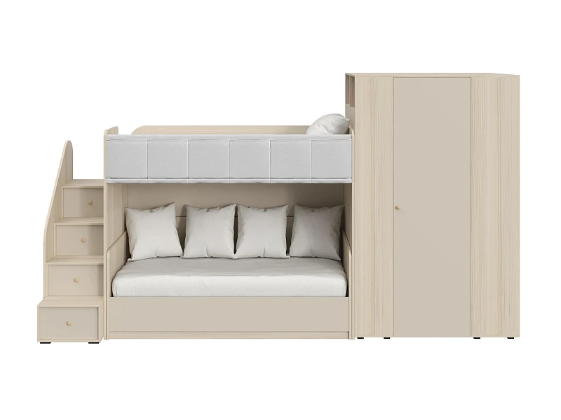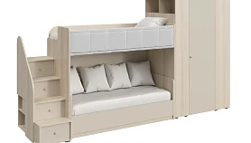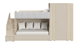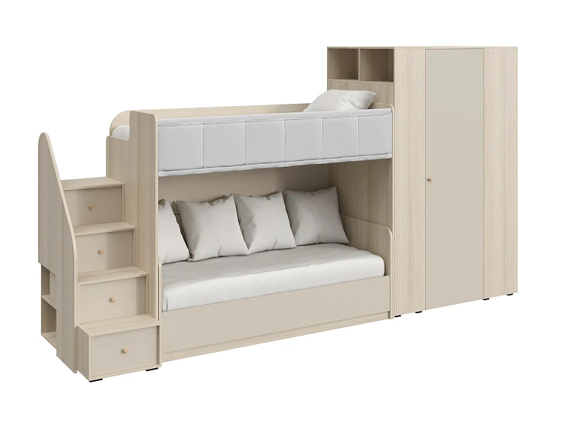 Play — коллекция модульной мебели для детской в спокойных оттенках светлого дерева с локальным добавлением ярких элементов. Естественные формы и цвета подружатся с любой стилевой темой. Подойдет как для дошкольников, так и для подростков. Изделия отвечают главным критериям детской мебели: безопасны, устойчивы, надёжны и эстетичны. Соблюдены экологические показатели, использована ЛДСП класса эмиссии Е1 и Е0,5 — для детской мебели с герметично закрытыми кромками. Из большого количества модулей вы можете спроектировать индивидуальное решение, исходя из потребностей и площади помещения. Для игровой локации, учебного места, спальной зоны, гардероба, хранения игрушек, техники и предметов для творчества — используйте модульные шкафы, стеллажи, тумбы, кровати-чердаки, столы, стеллажи-лестницы. Сквозные стеллажи идеальны в качестве перегородок в детской. Они пропускают свет, не перегружают площадь, позволяют использовать разные декоративные приёмы. Двухярусные кровати и «чердаки» удобно использовать в компактной локации. Шкафы напольные, навесные, тумбы, лаконичные столы — мебель Play поддержит атмосферу порядка и идеальный настрой на учёбу, творчество, поможет развить самостоятельность и аккуратность. Белые фасады отражают свет, освежают интерьер. С коллекцией Play вы легко создадите организованное и креативное пространство, в котором у каждой вещи есть своё место, и где ребенку комфортно учиться, играть, отдыхать, творить. Многофункциональная композиция для детской и молодежной. Ручки в стоимость изделия не включены, приобретаются отдельно.