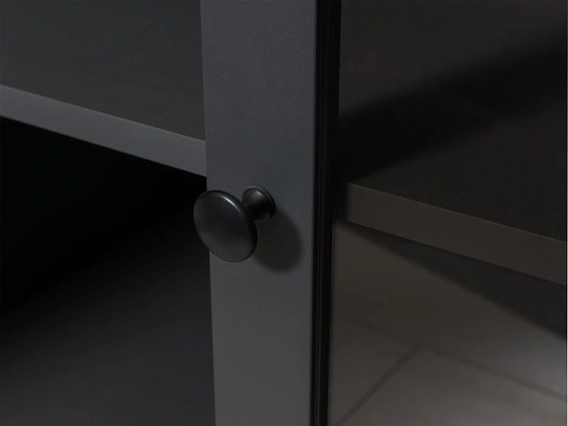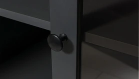 В стеллаже четыре полки. Вторая снизу – стационарная, остальные съемные, с перестановкой по высоте в 3 положения. Тумба состоит из двух отделений под общей крышкой. В каждом отделении ящик и две двери. За дверями съемная полка.