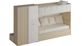Play — коллекция модульной мебели для детской в спокойных оттенках светлого дерева с локальным добавлением ярких элементов. Естественные формы и цвета подружатся с любой стилевой темой. Подойдет как для дошкольников, так и для подростков. Изделия отвечают главным критериям детской мебели: безопасны, устойчивы, надёжны и эстетичны. Соблюдены экологические показатели, использована ЛДСП класса эмиссии Е1 и Е0,5 — для детской мебели с герметично закрытыми кромками. Из большого количества модулей вы можете спроектировать индивидуальное решение, исходя из потребностей и площади помещения. Для игровой локации, учебного места, спальной зоны, гардероба, хранения игрушек, техники и предметов для творчества — используйте модульные шкафы, стеллажи, тумбы, кровати-чердаки, столы, стеллажи-лестницы. Сквозные стеллажи идеальны в качестве перегородок в детской. Они пропускают свет, не перегружают площадь, позволяют использовать разные декоративные приёмы. Двухярусные кровати и «чердаки» удобно использовать в компактной локации. Шкафы напольные, навесные, тумбы, лаконичные столы — мебель Play поддержит атмосферу порядка и идеальный настрой на учёбу, творчество, поможет развить самостоятельность и аккуратность. Белые фасады отражают свет, освежают интерьер. С коллекцией Play вы легко создадите организованное и креативное пространство, в котором у каждой вещи есть своё место, и где ребенку комфортно учиться, играть, отдыхать, творить. Многофункциональная композиция для детской и молодежной. Ручки в стоимость изделия не включены, приобретаются отдельно.