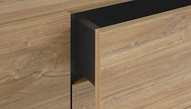 Особенность линейки заключается в контрасте элементов. Скругленные изящные металлические ножки поддерживают внушительное основание. При этом внешний вид моделей остается лёгким и элегантным. Также игру противоположностей усиливают древесная текстура на фасадах и черный цвет боковин с задней стенкой. Что придаёт большей динамики и выразительности дизайну. Эксклюзивность и завершенный вид воссоздает рамка, возвышающаяся над верхним горизонтом. Минималистичный вид конструкциям обеспечивает скрытая фурнитура. Двери и ящики открываются плавно, без шума и усилий. Комбинируйте комоды и серванты Look для создания целостного образа интерьера.