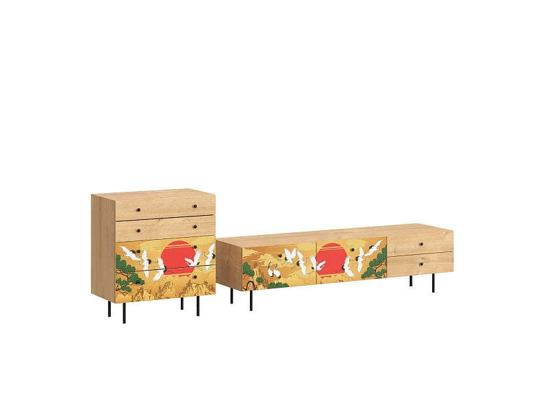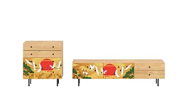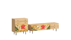 Корпусная мебель, с которой можно составить множество решений для гостиной, детской, кухни, спальни, прихожей, рабочей зоны. Комоды, шкафы, тумбы, столы, витрины, полки, серванты характеризуются универсальностью, многозадачностью, надёжными устойчивыми конструкциями. Имеют выразительный внешний вид, вдохновленный направлением ретро. Смотрятся легко и воздушно за счет деревянных ножек, минимального количества декоративных элементов, спокойных природных оттенков. Их можно использовать в качестве систем хранения, элементов для зонирования, фокусных точек. В дизайне ярко выражена доминанта прямых форм, графичности, лаконичных линий и элегантного исполнения. Что даёт пространству ощущение размеренности, сбалансированности, упорядоченности. Подходят интерьерам как с нейтральной базой, так и локациям с интенсивными цветовыми блоками. Индивидуальности добавят модели с оригинальными паттернами на фасадах. Предметы коллекции Frida гармонично впишутся в эклектичные и стилизованные интерьеры. Ручки входят в стоимость изделия. Высота опор 160 мм. Изображение, нанесенное на фасады, устойчиво к выцветанию, истиранию и влаге. Однако длительное воздействие воды, различных растворителей, спиртосодержащих жидкостей и высоких температур, увеличивают риск повреждения целостности покрытия. Поэтому при использовании необходимо соблюдать ряд правил: 1. Протирайте поверхность с рисунком влажной (но не мокрой) тканью. 2. Используйте мягкие ткани, например, салфетки для стекла или зеркал. 3. Не используйте для обработки поверхности с нанесенным на нее рисунком чистящие порошки и средства, в состав которых входят ацетон, растворитель или спирт. 4. Не используйте металлические губки и щетки с жесткой щетиной. 5. Избегайте ударов, падения, царапания, трения изделий с фотопечатью.