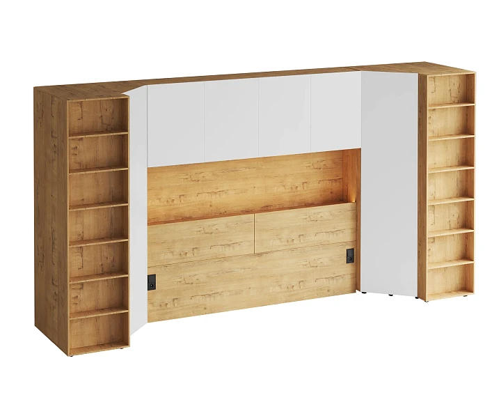 Линейка корпусной мебели, которая закрывает большинство потребностей по хранению и организации вещей. Универсальные и функциональные шкафы, тумбы, стеллажи, столы группируются по функциональны зонам. С их помощью можно обустроить прихожую, гостиную, кабинет, спальню, детскую. В основе дизайна — софт-минимализм с продуманными деталями и материалами. Скрытые механизмы открытия дверей, естественная древесная текстура, большая вместительность, белый цвет делают их исключительно удачными для большинства современных пространств. Гладкие фасады без декора и ручек поддерживают идею отказа от визуального шума, двери открываются по принципу «нажал-открыл». Мебель Modus создает уравновешенный интерьер с выразительными компонентами, настраивающими на ритмичный образ жизни, целеустремленность и чувство свободы от избыточных деталей. Кроватный блок предназначен для использования совместно с кроватью или диваном. Блок имеет два отделения за откидными дверьми и открытую полку над ними. Двери открываются за кромку, с помощью газовых кронштейнов. Кроватный блок оснащен светодиодным светильником, расположенным на открытой верхней полке. Светильник представляет собой алюминиевый профиль с матовым экраном, внутри которого установлена светодиодная лента. С левой и с правой стороны переднего щита блока установлены выключатели светильника и эл. розетки с разъемами USB А и Type C. Блок установлен на регулируемые опоры. Внутренние размеры отделений для хранения: 1160х850х260мм каждое отделение. Максимальная нагрузка на верхнюю полку не должна превышать 20 кг. Панель представляет собой щит из ЛДСП 16 мм. предназначенный для установки над кроватным блоком. Панель навешивается на регулируемые подвесы. Шкаф имеет три регулируемых подвеса для навешивания на стену. Полки имеют возможность перестановки по высоте в трех уровнях. Дверь открывается по принципу «нажал-открыл». Максимальная нагрузка на каждую полку не должна превышать 7 кг. Пенал Modus состоит из корпуса и фасада. Корпус с проходным нижним и верхним щитом установлен на опоры. Опоры регулируемые, пластик черный, круглые. Корпус горизонтальной стенкой разделен на два отделения по высоте. Верхнее отделение оснащено одной съёмной полкой, нижнее – пятью съёмными полками. Полки 6 – съемные, с перестановкой по высоте в 3 положения. Максимальная нагрузка на одну полку не должна превышать 4кг. Фасад представляет собой распашную дверь, которая открывается по принципу «нажал-открыл». Установка двери возможна с открыванием как в левую, так и в правую сторону.